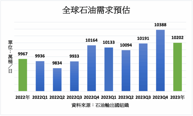 報告表示,10月份布蘭特原油均價為每桶93美元,而未來一年原油價格仍可能持穩在現有水平,主要因為供應的縮減,以及雖然預期全球經濟增長放緩,但石油消費需求的增長預期仍將會超過產油增長的影響。報告預估,2023上半年的布蘭特原油均價為每桶94美元,至2023年第四季的布蘭特原油均價預期將達到每桶98美元,2023全年的布蘭特原油均價預估為每桶95美元。