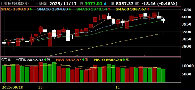 中國滬深兩市三大指數今(17)日持續集體開低,受到太陽能板塊下挫、弘元綠能(603185.SH)領跌,以及創新藥/貴金屬板塊走低的拖累,滬指呈現開低走低,終場收跌0.46%,連續2日走跌、日K2黑,失守月線。