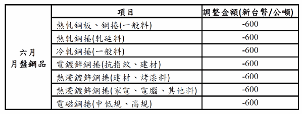 整體來看,中鋼表示,即便目前匯市暫已回貶趨穩,惟為協助下游用鋼產業並確保接單競爭力,同時依客戶各產業特性,持續搭配多元方案,攜手下游共同爭取訂單,故決議針對6月份之月盤產品,盤價全面下調。