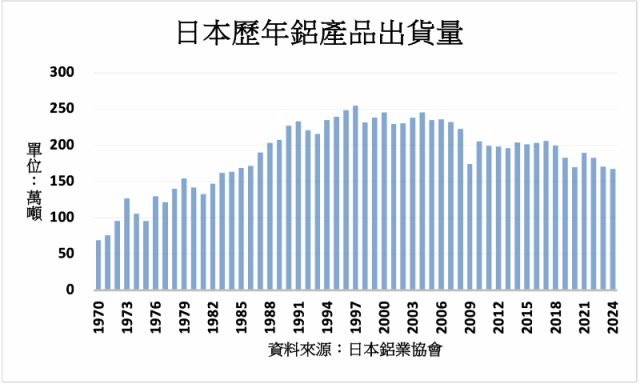 2024全年,日本鋁產量以及出貨量均連續第三年下滑。其中,鋁壓延產品(板材+擠型材)的總出貨量年減2%至約167.3萬噸,連續三年下降。生產量年減1.8%至約166.6萬噸,同樣連續三年下降。