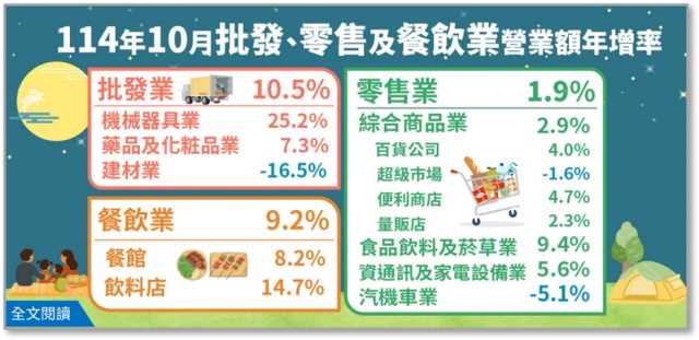 經濟部統計處今(25)日公布10月批發、零售及餐飲業營業額統計,其中批發業連續9個月正成長,並創下歷年單月次高紀錄,零售及餐飲業10月營業額都轉為正成長,並雙雙創下歷年同月新高。