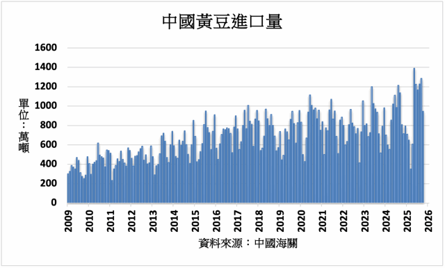 中國海關的數據顯示,9月黃豆進口量年增13%至1,287萬噸,創下史上的單月次高,已連續5個月突破千萬噸,10月份進口量下滑至948萬噸。中國是最大的黃豆進口國,2024全年進口量年增6.5%至1.05億噸,創下歷史新高。
