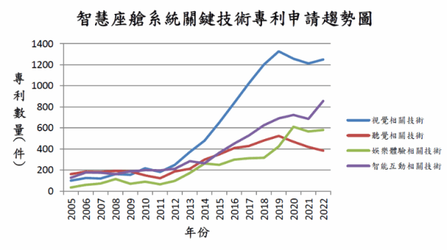 聽覺相關技術上,主要針對語音互動、聲學輸入輸出及聲學環境相關技術進行分析。該類技術專利申請國家或地區主要為中國、美國及日本;專利申請數量自2011年開始呈現上升趨勢,但2019年後開始逐步下滑。智慧局表示,雖然聽覺相關技術整體趨勢下滑,但檢視各分類技術,其中聲學輸入相關技術專利仍然處於上升趨勢據統計,該類技術2004至2022年累計專利申請數量前三大申請人分別是南韓現代汽車、日本三菱電機公司及美國福特汽車。