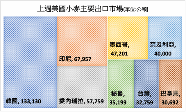 美國農業部5月27日公佈的每週出口檢定報告顯示,截至5月22日當週,美國小麥一週出口檢定量為561,980公噸,佔穀物出口總量的25%;較前週增加30%,較上年同期增加41%,主要出口市場為韓國(133,130公噸)、印尼(67,957公噸)。自6月起的2024/25年度小麥累計出口量年增16%至21,272,049公噸。美國農業部5月報告維持2024/25年度美國小麥出口量預估為年增16%至2,232萬噸,2025/26年度小麥出口量預估為2,177萬噸。