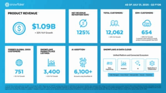 人工智慧(AI)數據雲端公司Snowflake Inc.於美國股市週三(8月27日)盤後公布2026會計年度第2季(截至2025年7月31日為止)財報:產品營收年增32%至10.91億美元,非一般公認會計原則(Non-GAAP)每股盈餘年增94.4%至0.35美元。