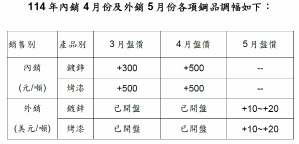 燁輝(2023)今(31)日開出4月份內銷及5月份外銷盤價。燁輝表示,在全球鋼市持續加溫下,激勵亞洲各主要鋼廠樂觀看待後市,隨著鋼市在旺季下審慎樂觀,主基調仍為穩中求升,故決議4月份內銷鍍鋅、烤漆均調漲每噸500元,5月外銷鍍鋅、烤漆每噸調漲10-20美元。