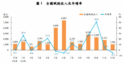 在主要稅目別變動上,12月實徵淨額與上年同月比較,以營業稅減少116億元、營利事業所得稅減少23億元、貨物稅減少21億元較多;2024全年實徵淨額與上年比較,以證券交易稅增加907億元、綜合所得稅增加671億元、營利事業所得稅增加386億元、營業稅增加366億元較多。
