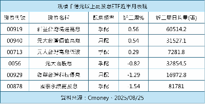 進一步觀察6檔規模千億元以上的高股息ETF 近半月來的績效表現,群益台灣精選高息(00919)、元大台灣高息低波(00713)、元大台灣價值高息(00940)3檔繳出正報酬,其中00919的含息報酬率達0.56%,表現居冠,展現高息型ETF攻守兼備的優勢。