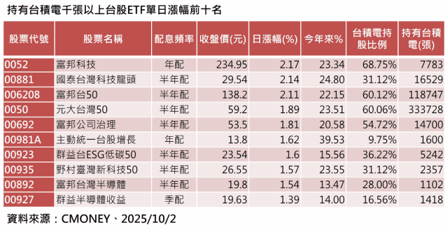 10月第二個交易日,台股雙喜臨門,創收盤及盤中最高紀錄;護國神山台積電(2330)也創下收盤與盤中新高,並帶動含積量高的台股ETF績效長紅。