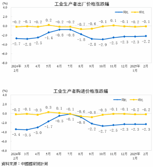 中國國家統計局公布,今(2025)年2月全國工業生產者出廠價格(PPI)年減2.2%,降幅較上月收斂0.1個百分點,略遜於市場預期的年減2.1%;工業生產者購進價格年減2.3%。累計今年1-2月平均工業生產者出廠價格較去年同期下降2.2%,工業生產者購進價格下降2.3%。