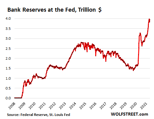 Richter指出,準備金是銀行存放在Fed的現金,是Fed資產負債表上對銀行的欠債。Fed對這些準備金支付利息(目前0.1%),Fed資產負債表上的存款準備金如今已激增至3.92兆美元(見下圖)。