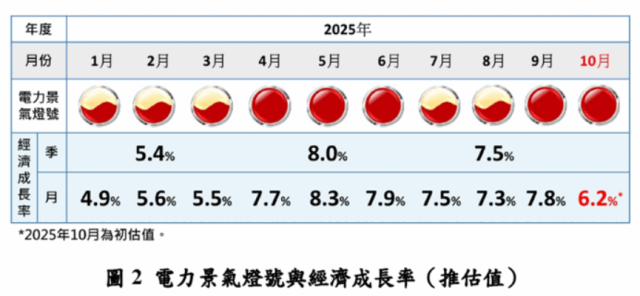 在科技產業的領航下,半導體與電子業憑藉高附加價值優勢,不僅推升產業用電漲幅,也成為帶動國內經濟向上的核心引擎。反觀傳統產業仍受關稅負擔、國際需求放緩及終端市場回升遲滯等因素壓力,生產與用電動能偏弱,產業結構調整需求仍須強化。整體而言,台綜院表示,在全球AI與先進製造需求熱絡的支撐下,國內經濟成長動能持續擴張且具韌性,預測今年10月經濟成長率為6.2%。