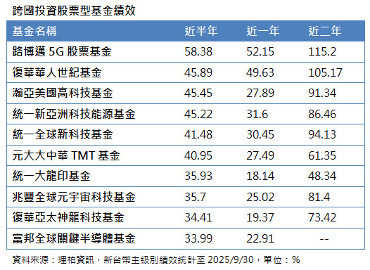 由於各股市多頭百花齊放,加上又有AI等具高成長契機趨勢產業題材加持,提供主動式操作共同基金布局亮點。理柏資訊統計(截至2025/9/30),近半年投信發行跨國投資股票型基金漲幅超過3成就有14檔,其中路博邁5G股票、復華華人世紀、瀚亞美國高科技、統一新亞洲科技能源、統一全球新科技、元大大中華TMT等基金更有逾4成至近6成的超額投資報酬表現,布局的股票市場主要集中在美、台、中、日,產業則以資訊技術為大宗。