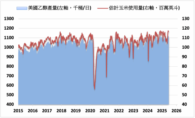 美國能源部月報預估今明兩年乙醇日均產量皆為105萬桶。從季度數據來看,預計今年第二季的燃料乙醇產量為每日103萬桶,第三季增至每日104萬桶,第四季則為每日105萬桶。進入2026年後,預計第一季為每日105萬桶,第二季為104萬桶,第三季為103萬桶,第四季則回升至106萬桶。