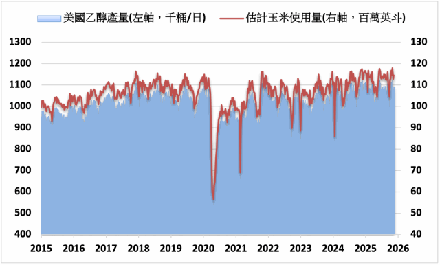 根據美國能源部預測2026年乙醇的淨出口與產量將維持在接近歷史高位,原因包括預期玉米產量將創新高,以及與今年推動乙醇生產與出口相同的市場因素。報告預測乙醇消費將繼續低於疫情前水準,因為汽油消費預計將保持平穩。