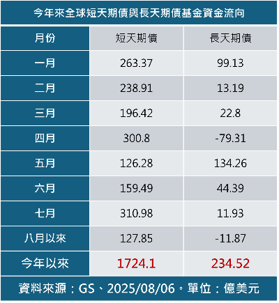 MoneyDJ新聞 2025-08-18 16:41:18 新聞中心 發佈 今年以來市場多空交錯,而聯準會謹慎降息政策,也在市場持續揣測降息時間點與降息力道的過程間,進一步影響對於債券的投資偏好與資金流向。市場法人表示,值得留意的是,短天期債因波動度低,也同樣能提供收益,反倒脫穎而出獲得青睞,資金淨流入金額明顯優於長天期債,可見在今年這樣高波動、政策方向難料的環境中,短天期債為實現穩定收益與波動控管兩大投資目標下的最佳選擇,投資人也不妨適度配置短天期債ETF來為投資組合強化抗震收益效果。