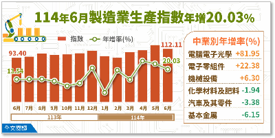 其中,因人工智慧及雲端運算等新興科技應用持續熱絡,推升AI伺服器、半導體設備及電子零組件等出貨量能,加以國內常規藥品及疫苗鋪貨需求增加,致機械器具批發業6月營業額年增12.7%、藥品及化粧品業年增4.1%;惟部分進口車延後交車,加以下游產業及經銷商備貨保守觀望,致汽機車批發業6月營業額年減18.7%、建材批發業年減5.4%、綜合商品批發業年減7.7%。