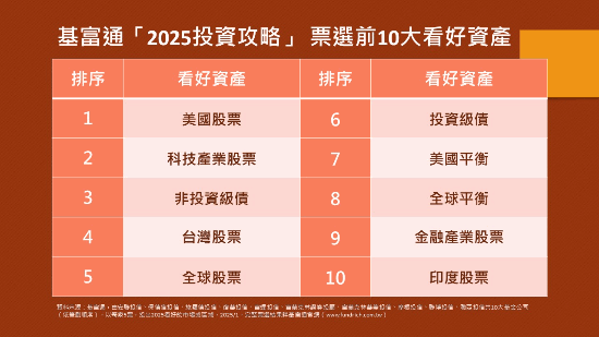 2025年投資機會點在哪裡?為協助投資人掌握新年度的趨勢商機,國內最大基金交易平台-基富通結合10大投信投顧業者舉辦「2025市場攻略」票選活動,看好度前3名分別是美國股票、科技產業股票、非投資等級債券,同時推出全平台基金定期定額、單筆申購通通終身0手續費優惠,讓投資贏在起跑點。