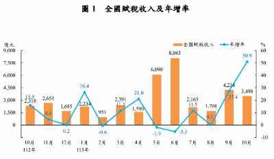 財政部公布10月全國稅收實徵淨額3,498億元、年增50.9%,其中以營利事業所得稅增加1,020億元、綜合所得稅增加64億元、證券交易稅增加62億元較多;累計1至10月實徵淨額3兆2,951億元、年增9%,以證券交易稅增加822億元、綜合所得稅增加637億元、營業稅增加448億元、營利事業所得稅增加428億元較多。