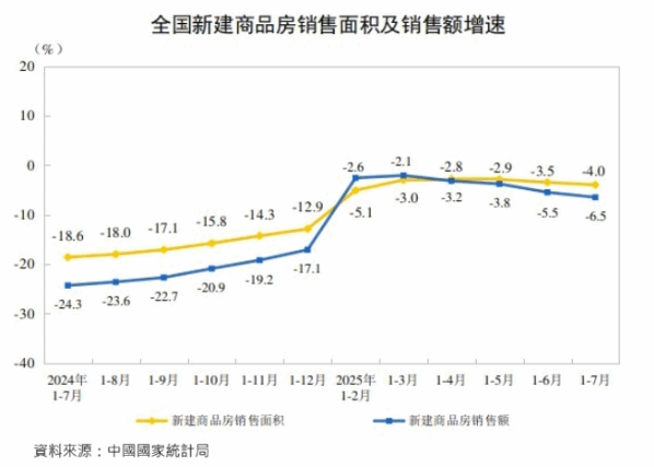 中國國家統計局今(15)日公布,今(2025)年1-7月新建商品房銷售面積5億1,560萬平方米、年減4%,續呈負成長,降幅較1-6月擴大0.5個百分點;其中住宅銷售面積下降4.1%。1-7月新建商品房銷售額4兆9,566億元(人民幣,下同)、下降6.5%,降幅較1-6月擴大1個百分點;其中住宅銷售額下降6.2%。截至7月底,商品房待售面積7億6,486萬平方米,較6月底減少462萬平方米;其中,住宅待售面積減少285萬平方米。