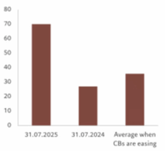 技術指標支持我們對全球資產維持整體中立的立場,以及我們對新興市場的偏好。就全球債券而言,市場情緒和趨勢訊號皆屬中性,而新興市場債券則獲得全面的趨勢支持。全球股票方面,整體趨勢偏向正面,但8月和9月的季節性因素偏弱,抵消了這一優勢。資金流向方面,投資人對新興市場當地債券的興趣持續,同時資金從防禦型股票轉向景氣循環股。