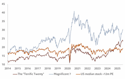 我們對美國維持中立立場。我們預計今年美國企業獲利成長僅為2%,比市場預期低約7個百分點,主要是關稅影響開始顯現。美國仍是估值最不具吸引力的區域。我們的分析顯示,20家美國大型股(我們稱之為「精彩二十」)的估值水平正趕上「驚奇七」,這說明投資人的熱情及股價溢價已從科技巨頭擴散到更廣泛的公司。