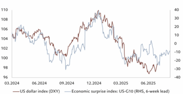 美元指數(DXY)、經濟驚奇指數:美國與G10國家(右軸,領先六週)