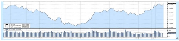 加權股價指數近6個月價量表現:(資料來源:Bloomberg,