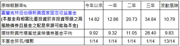 富蘭克林坦伯頓新興國家固定收益基金截至7月底之基金持債到期殖利率高達12.63%(資料來源:富蘭克林坦伯頓基金集團),投資以新興國家當地公債為多,搭配約一成多的美元計價主權債,彈性掌握高殖利率政府債機會。經理團隊首重紮實的基本面研究,並常拜訪各國以真切了解貨幣、財政和經濟狀況。藉由團隊合作找尋有被低估的債券和貨幣機會,因此短中長期績效均為同類型的第一名。(詳附表)。