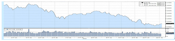 加權股價指數近6個月價量表現:(資料來源:Bloomberg, 截至2022/11/2)
