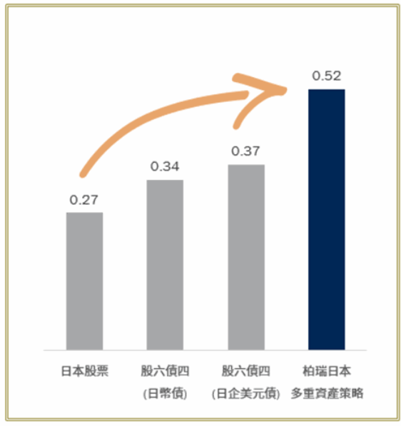 接下來要如何搭上日本股債市的新多頭行情?柏瑞日本多重資產基金(本基金配息來源可能為本金)預定經理人方定宇表示,藉由股債合一、攻防一體的日本多重資產策略,不但較持有單一資產的投資效率大躍進(圖一),更可參與日本股債市的中長期漲升契機。