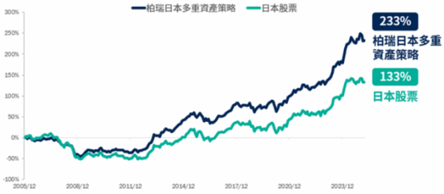 根據Bloomberg統計,自2005/12/31到2025/3/31這段期間,柏瑞日本多重資產策略的投資效率為0.52,優於日本股票的0.27,亦優於股六債四(日幣債)的0.34。此外,柏瑞日本多重資產策略的模擬成效為233%,亦高於日本股市133%(圖二)。