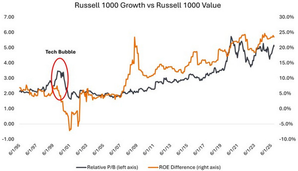 AI的強勁需求方興未艾,相關類股漲勢凌厲,雖然近期轉趨震盪,AI成長依然趨勢不變。惟目前美股價值面偏貴,開始出現股市可能泡沫化的聲音。對此,駿利亨德森投資指出,現階段美股與2000年時期科技泡沫化有顯著的差異,目前成長股的ROE(股東權益報酬率)大幅超越價值股,良好的基本面能夠有效地支撐其高估值。面對市場震盪格局,建議投資人選擇股六債四為主的美國股債平衡型基金,在持續參與美股成長機會的同時,亦能降低短線波動風險。
