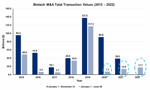 目前生技類股多頭行情仍在,劉翠玲分析,除NBI指數長期投資價值浮現,因生技產業在2020年至2022上半年平均併購金額明顯低於過往7年平均上半年併購金額43億,但隨著Covid-19新冠疫情逐漸退去,企業遞延併購案已陸續出現,推升全年度企業併購案總金額,不僅如此,新藥研發解盲成功,也持續傳利多。