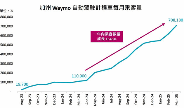 不管在日常生活中或者是工作上,我們對AI工具的依賴越來越深,從ChatGPT目前擁有8億週活躍用戶,每天處理超過10億次查詢的數據,便可觀察到這一點。而在自駕車領域,也受惠於AI性能及發展更加完備下,可以在不斷擴大的自駕車市場中實現商業化。例如Alphabet旗下的自動駕駛汽車子公司Waymo,每月在加州完成超過70萬次自動駕駛計程車出行,而一年前的數據甚至只有11萬次。Waymo更是與Uber合作於亞特蘭大推出自駕計程車服務,透過Uber平台可以讓自駕車的使用次數快速增加。
