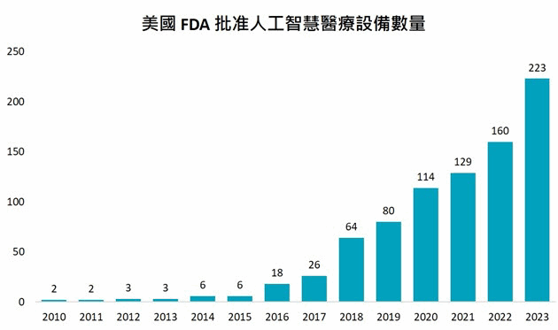 AI正全面改寫全球醫療照護領域,從影像判讀、診斷建議、病例整理到蛋白質設計、藥物研發,加速醫療效能與持續創新。美國每年醫療支出高達4.5兆美元,若能透過導入AI至醫療上,其產值便相當可觀。此外,美國食品藥物管理局(FDA)亦積極開放AI醫療創新,2023年已批准223項AI醫療裝置,相較2015年僅6項,成長逾36倍。