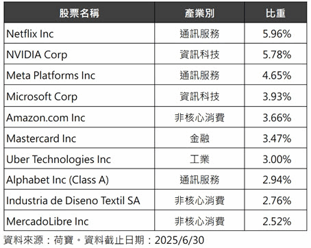 所謂結構性贏家是指產品或服務品質較高、具備規模優勢、擁有卓越品牌或定價能力之企業,中長期表現往往優於同業。而荷寶環球消費新趨勢股票基金,聚焦結構式赢家,選擇高成長、高品質的優質成長股,並結合「數位轉型消費」、「中產階層新興消費」、「生活優質消費」三大具潛力的超級趨勢,AI的崛起也將釋放三大趨勢的成長潛能。本基金的前十大持股,截至6/30著重於數位轉型消費趨勢,有望乘著AI浪潮持續成長。