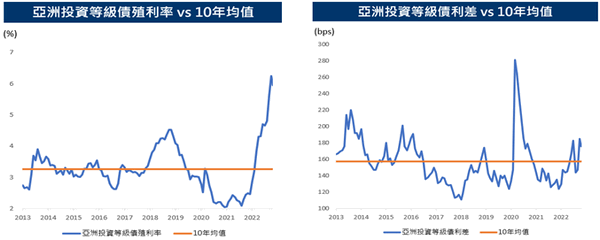 近期亞洲投資等級債殖利率將近6%,10年均值約3.3%,殖利率較長期均值高,可望吸引穩定高配息率的投資人流入。亞洲投資等級債利差為176基點,近10年均值為158基點,有均值收斂空間,評價面具有優勢。