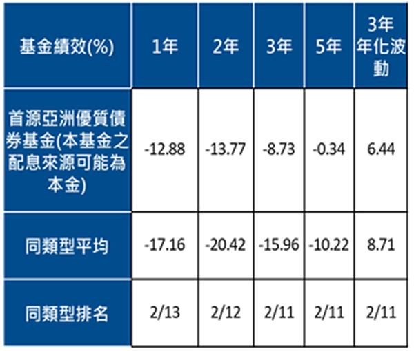 首源亞洲優質債券基金(本基金之配息來源可能為本金)成立於2003年,聚焦亞洲投資等級的美元債券,專注於品質好的企業。近20年來歷經金融海嘯、歐債危機至近年的新冠疫情、中國房地產風暴及今年的激進升息,歷經短線拋售潮引導殖利率急升後,後續多能回歸至常態水準,價格亦隨之回升。本基金近1、2、3及5年的表現在同類型基金中名列前茅,近3年年化波動率僅6.44%,為所有同類型基金中第二低。