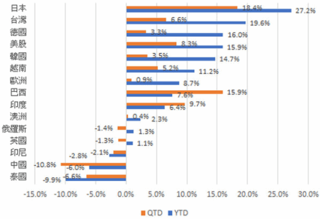 主要股市今年以來&本季以來漲跌幅表現(%)