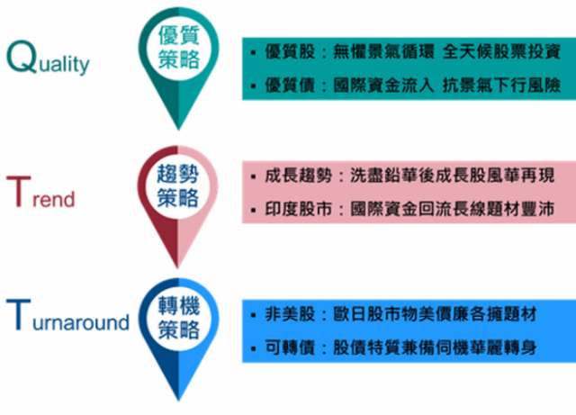 優質策略:國泰投顧看好具有低景氣相關並具有高定價能力的優質品牌企業,這些公司顧客忠誠度高、營收可預測性高、股價的波動度也相對較低,特別適合景氣趨緩期間作為投資組合中股票的核心布局壓艙石;同時,優質的投資等級債券今年受惠於國際資金流入,低違約率的優勢也有助於抵抗景氣下行風險。