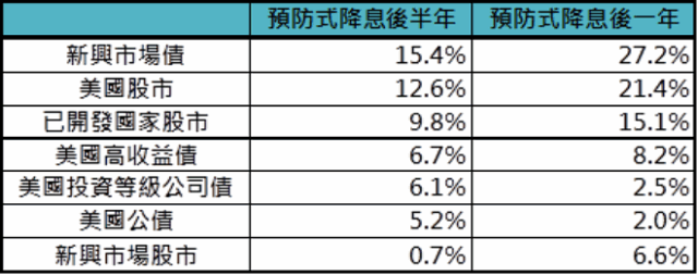 1995年7月6日聯準會開始預防性降息後,未來半年新興市場債券與美國股市分別上漲15.4%與12.6%,未來一年兩者分別上漲27.2%與21.4%,表現都優於其他資產。如果此次降息真如聯準會所預期,美國經濟數據維持強勁且通貨膨脹率慢慢降至2%,那新興市場債券與美國股市未來表現可期。