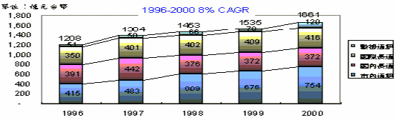 據MIC資料顯示,台灣1996-2000年的固網業務,年平均成長率約8%,而其中國際電話所占比重則由1996年的28.97%,至2000年的25.05%,且成長有趨緩的現象。主要在於先前台灣國際語音市場為中華電信一家所提供,缺乏競爭及連外頻寬費用過多,以致需求受到壓抑而甚少成長,不過在開放海底電纜及相關的國際電路出租業務之外,再加上ISR開放使得國際語音得以商品化,以及中華電信調降費率等動作,將使得國際語音市場的需求得以剌激,我們預期台灣國際語音市場,將因此波電信自由化政策及供給大增、價格大幅下降下,而短期內話務量可成長15-20%以上。