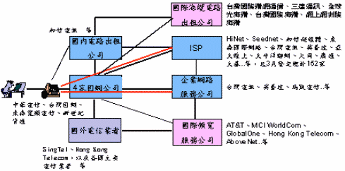 另外,有意角逐台灣ISR市場,國外電信業者及電路出租等具有電信傳輸設備的業者,主要經由自建或合資海底電纜,再出租國際專線及頻寬為主,而台灣國際語音轉售業務的市場,在中華電信大幅調降費率下,及國內多家固網業者的瓜分下,純語音轉售的利潤不高,因此介入競爭的動機較不高,多數透過策略聯盟與國內既有的第二類電信業者、ISP業者及國際海纜出租業者合作。