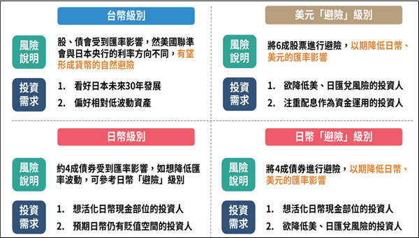 A:本基金(尚未成立)將提供新台幣、日幣、日幣避險和美元避險等級別,並採用多種避險策略應對匯率變化滿足投資需求。透過約6成的日股(日幣)搭配約4成的日企美元債(美元)的多重資產配置策略,以較高效率參與日本未來長期經濟發展潛力。