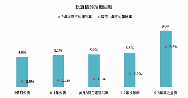 進一步觀察這三種短存續期間基金的投資標的,可以更清楚了解每一種投資工具績效的差異。到期日越短且違約率越低的債券報酬率越低,3個月美國公債被視為無風險利率,因此其今年以來的平均殖利率最低,為4.9%;到期日越長且違約率高的高收益債券,報酬率較高,0~3年到期的高收益債券,今年以來平均殖利率高達9%;而美元3個月定存利率不論是風險和報酬率都落在中間,平均利率為5.2%。