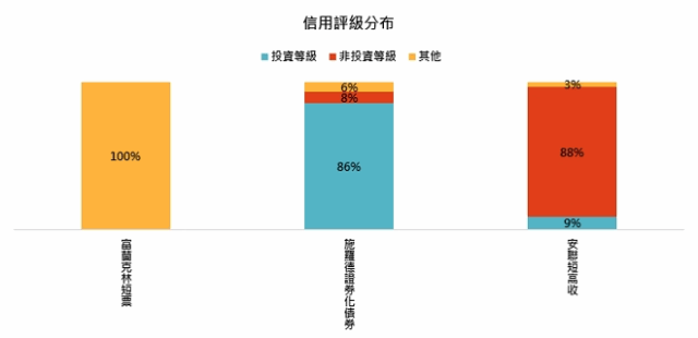 從信用評級分布圖可以更清楚了解這三檔基金的組成差異。富蘭克林短票因為投資貨幣市場工具沒有信用評級分數的資訊,代表幾乎無違約風險;施羅德證券化債券的投資部位組成以86%的投資等級債為主;而安聯短高收則以88%的非投資等級債為主。