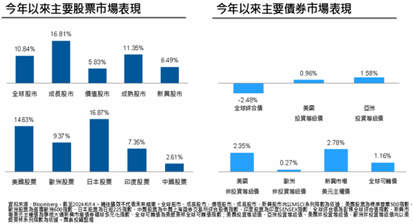 2024年上半年全球市場表現「 股優於債」 , 美股為主的成熟市場優於新興市場, 類股族群以成長股表現優於價值股;