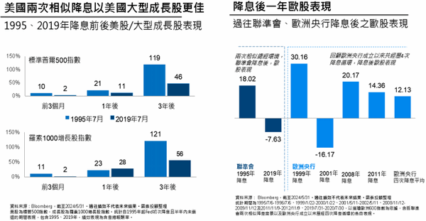 舉例來看,美國1995年、 2019年啟動降息後一年的美股大盤分別再上漲21%、 11%,成長股為主的羅素1000增長股指數則是上漲23%、