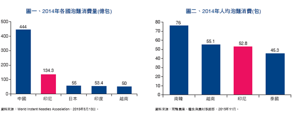 在印尼國內,每年的泡麵消費量高達134億包,僅次於中國大陸的444億包(圖一)。而印尼還不是世界上最愛吃泡麵的國家,根據南韓農業、糧食與農村事務部的統計,2014年全球每人平均泡麵消費量最高的國家是南韓,高達76包,平均每週要吃掉一包以上的泡麵,越南、印尼、泰國分別以55包、53包、45包位居第二至第四位(圖二),也由此可見泡麵在亞洲的巨大商機。